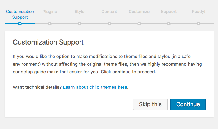 If you would like the option to make modifications to theme files and styles (in a safe environment) without affecting the original theme files, then we highly recommend having our setup guide make a child theme for you.