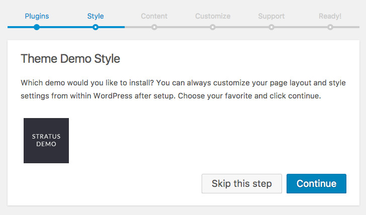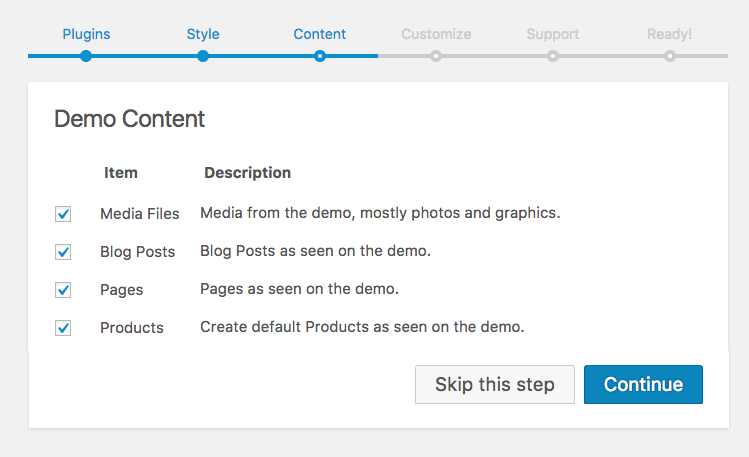 Getting started is easier with demo content. We recommend checking all boxes as you can always choose to remove content from within WordPress after setup.